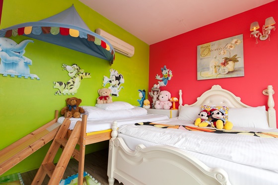 溫馨寬敞的房型設計,充滿生氣的綠色色調,營造出活潑舒適的歡樂氛圍,隨處散落大大小小的布偶、球球屋等設施,讓小朋友玩得不亦樂乎。